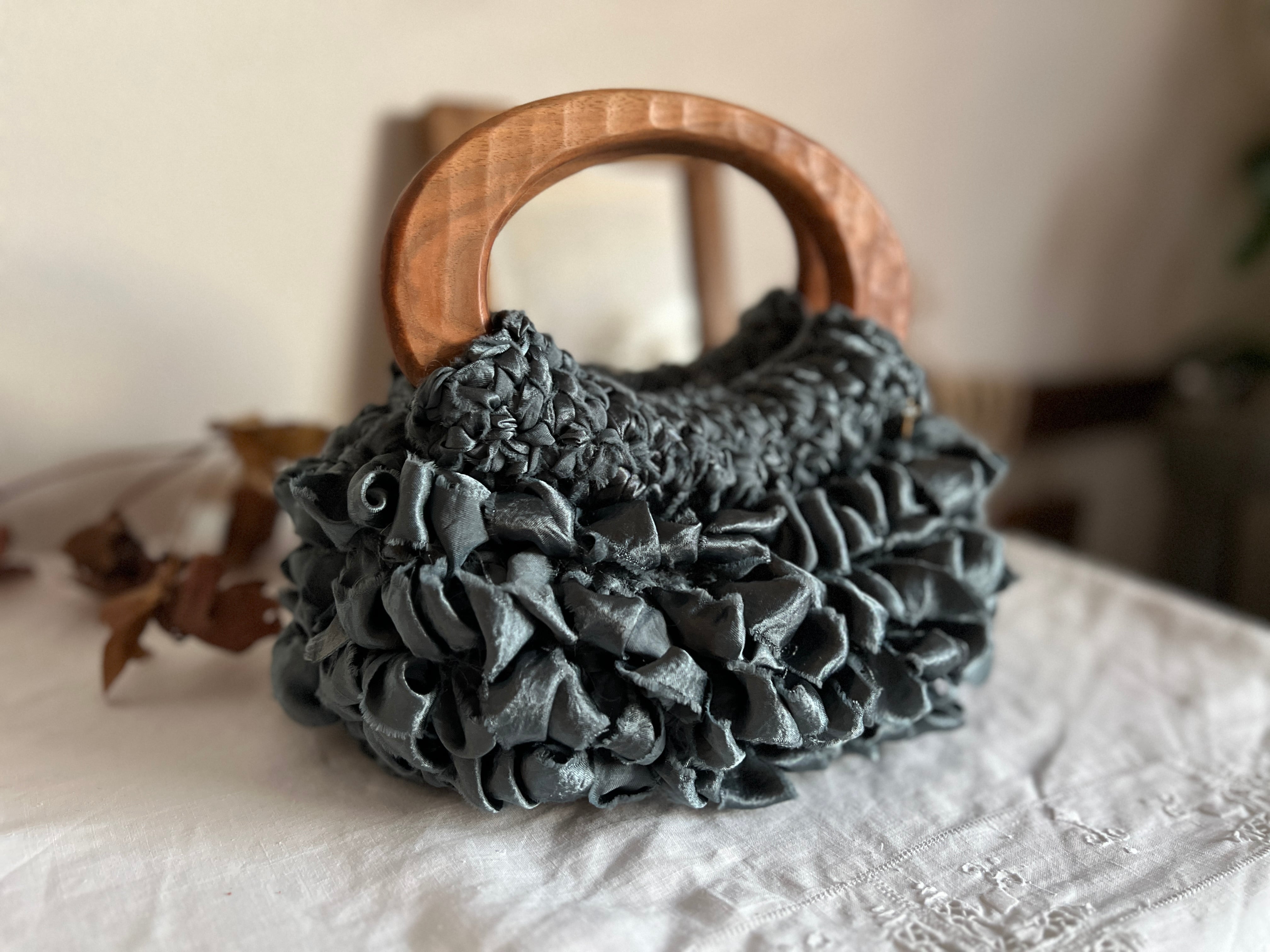 絹のように艶感のある光沢性としなやかさでカジュアル過ぎない大人可愛い上品な裂き編みバッグ。
