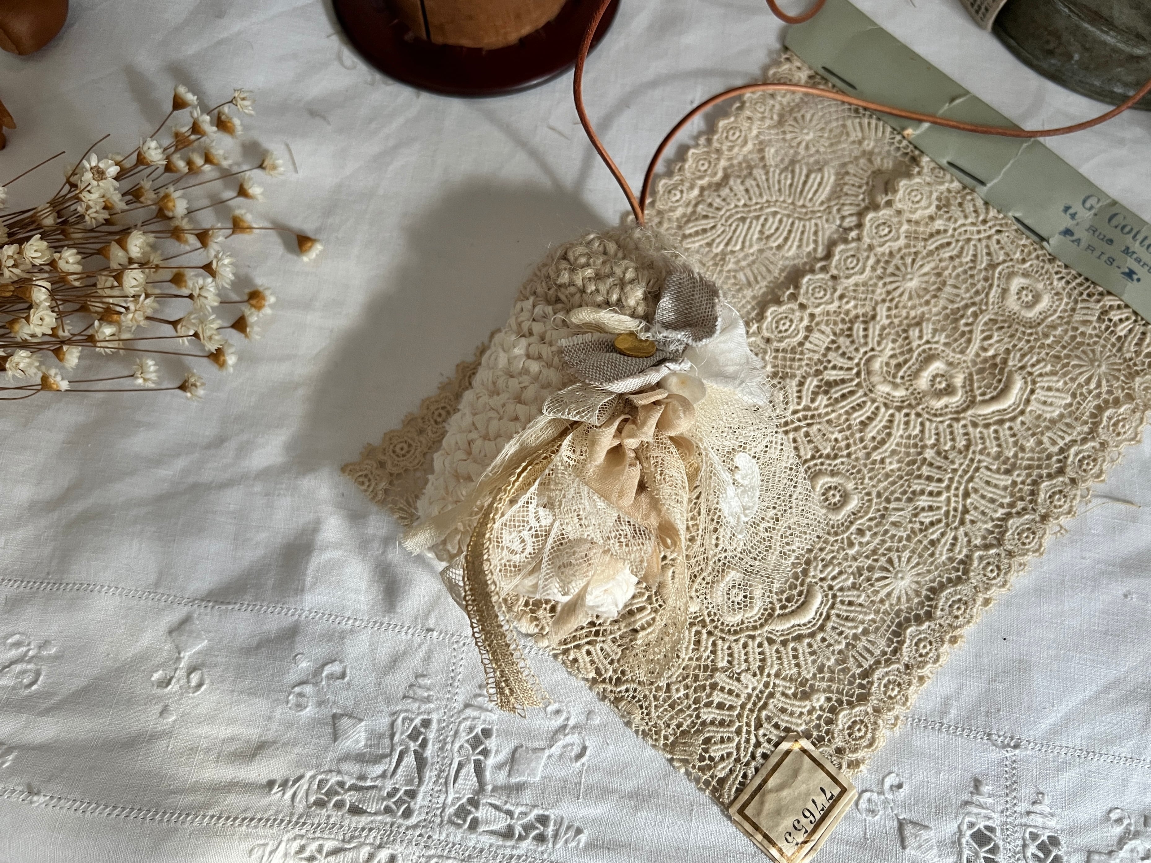 ウールジュートと裂き編みの本体にアンティークレースや裂き布を細やかにアレンジしています。