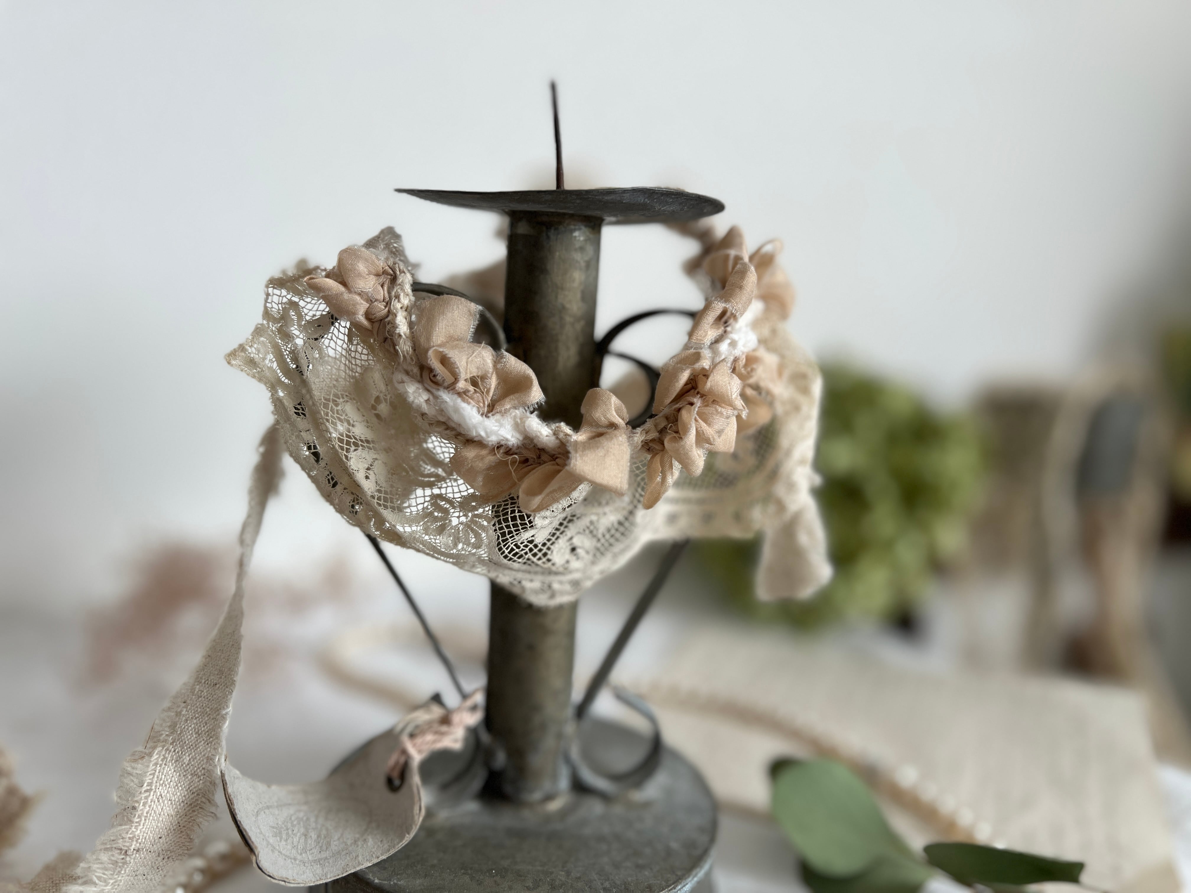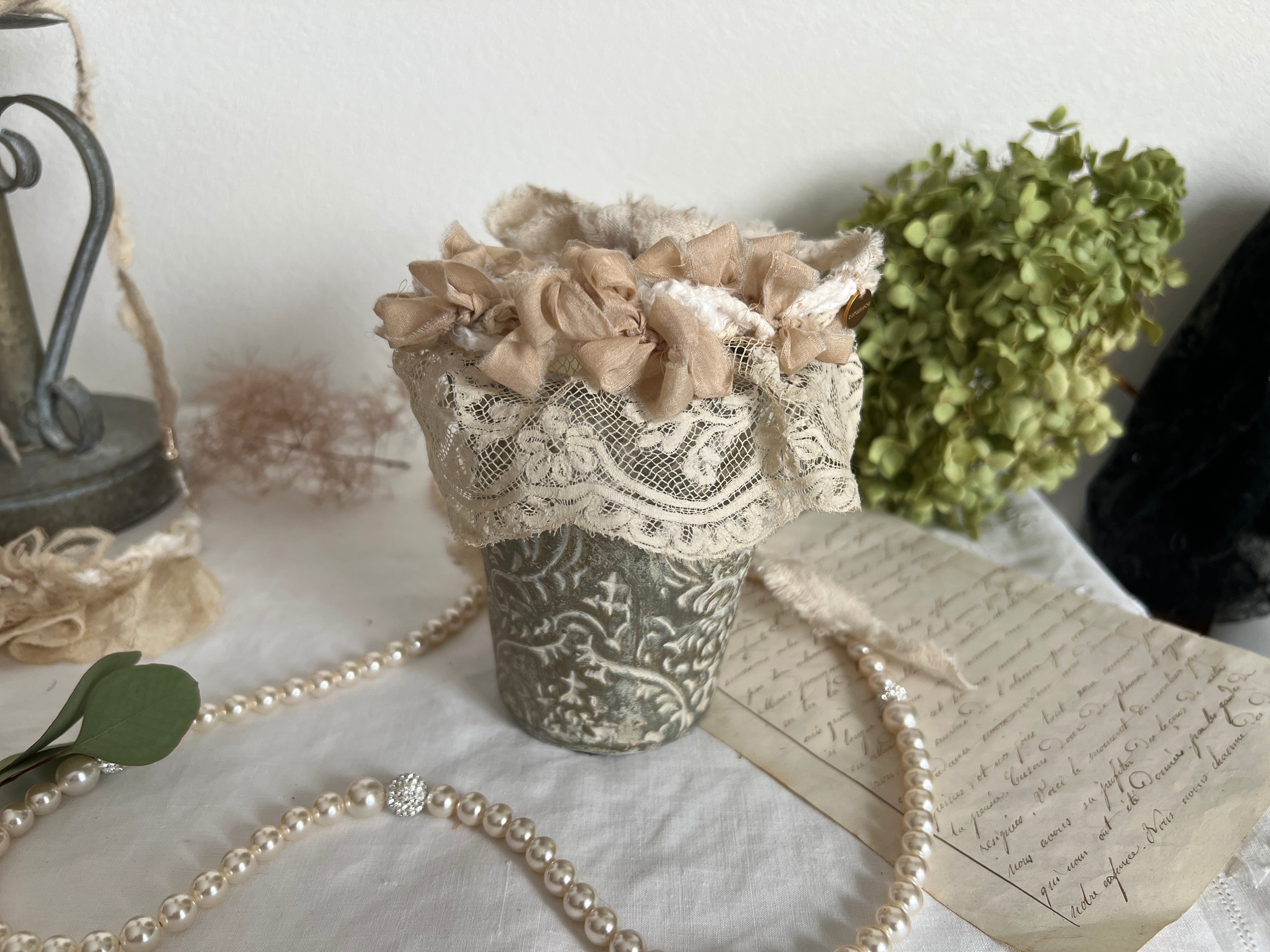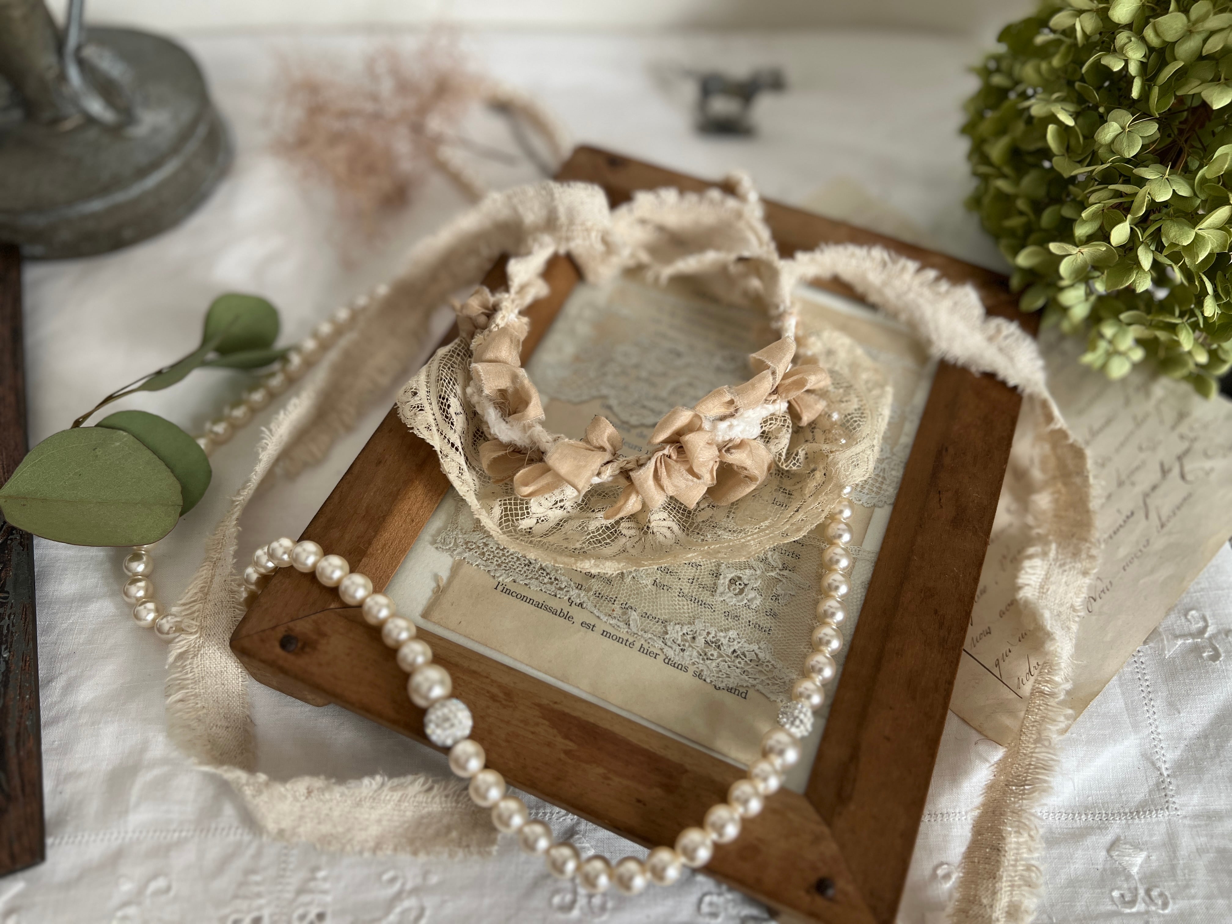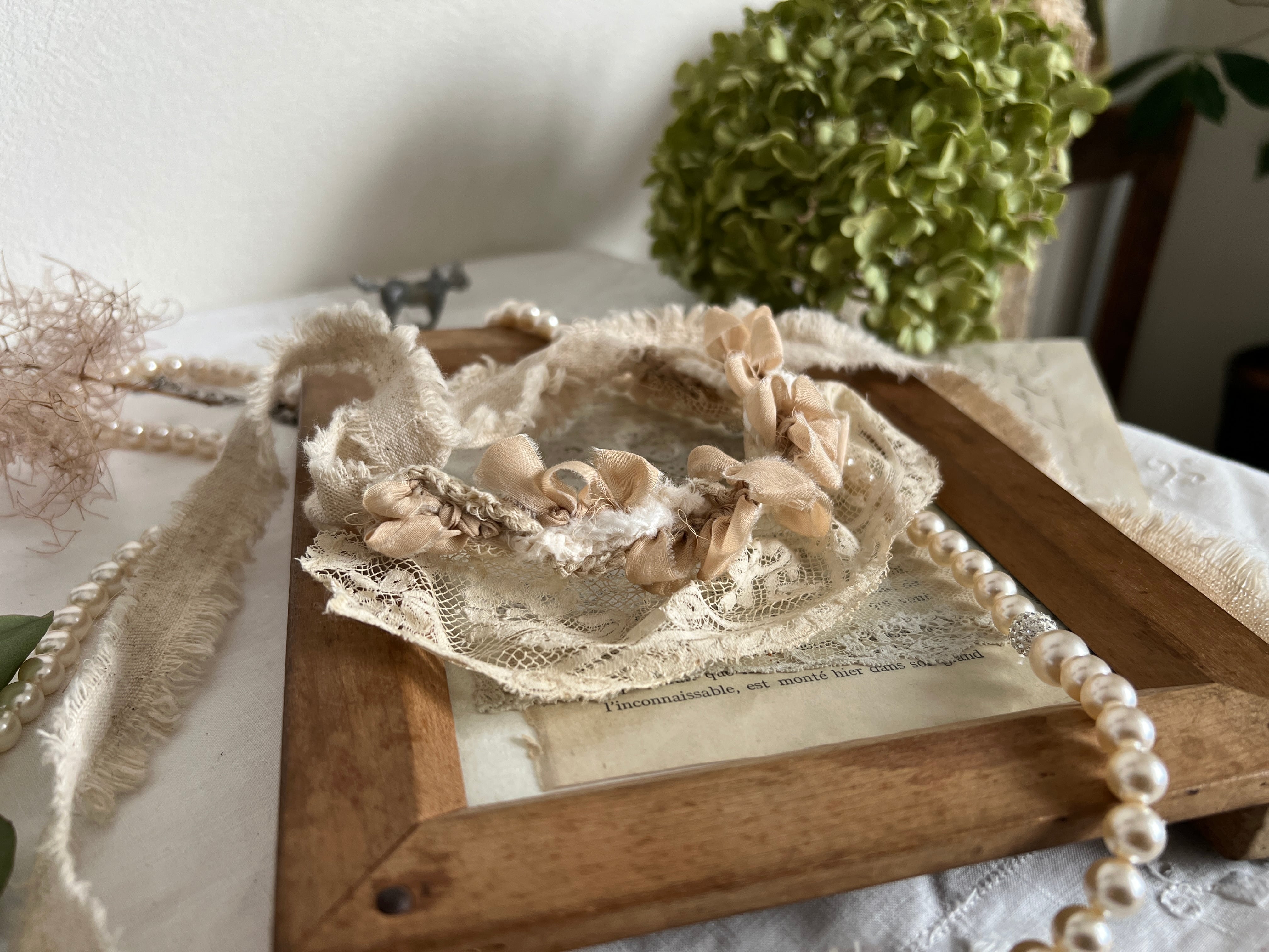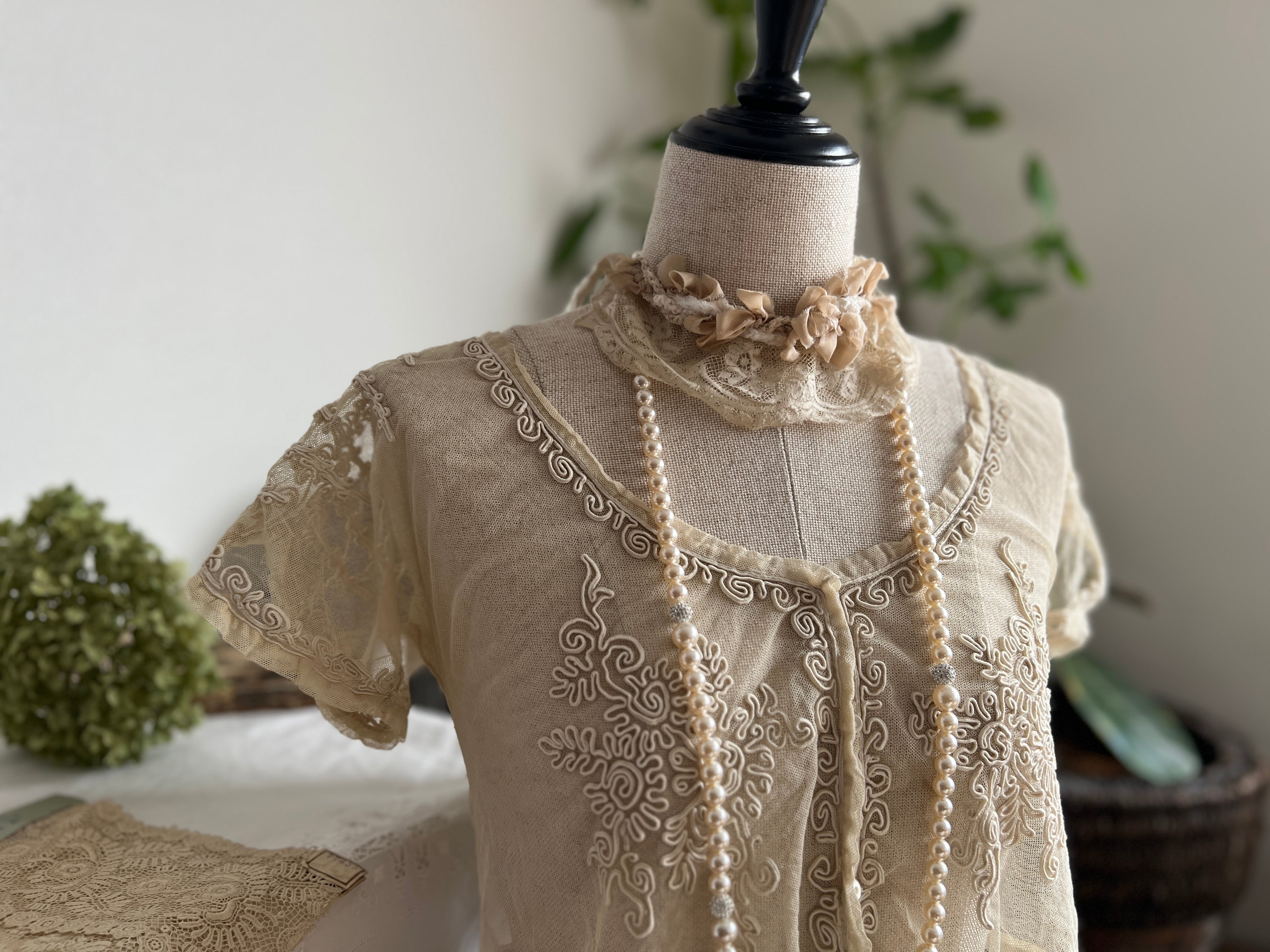 裂き編みのふわりとやわらかな表情に可憐なアンティークレースが絶妙な一品です。