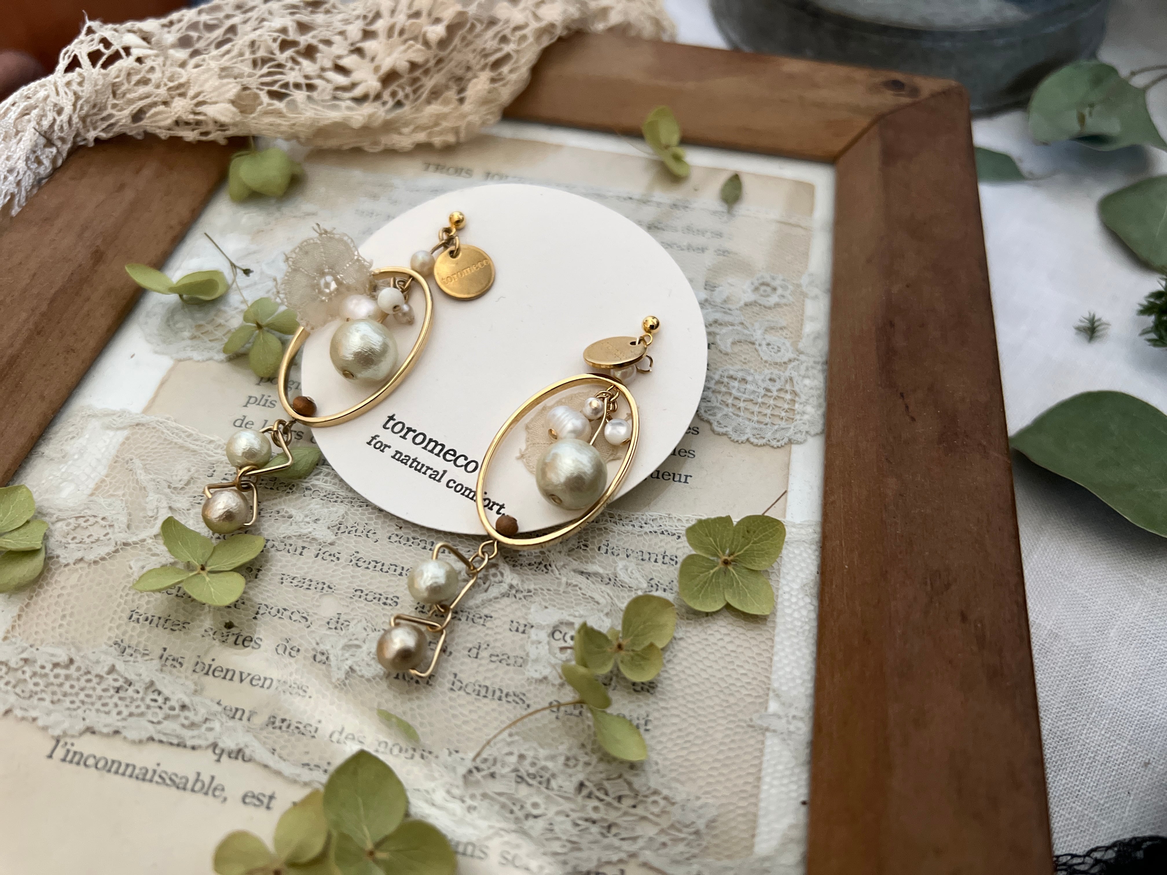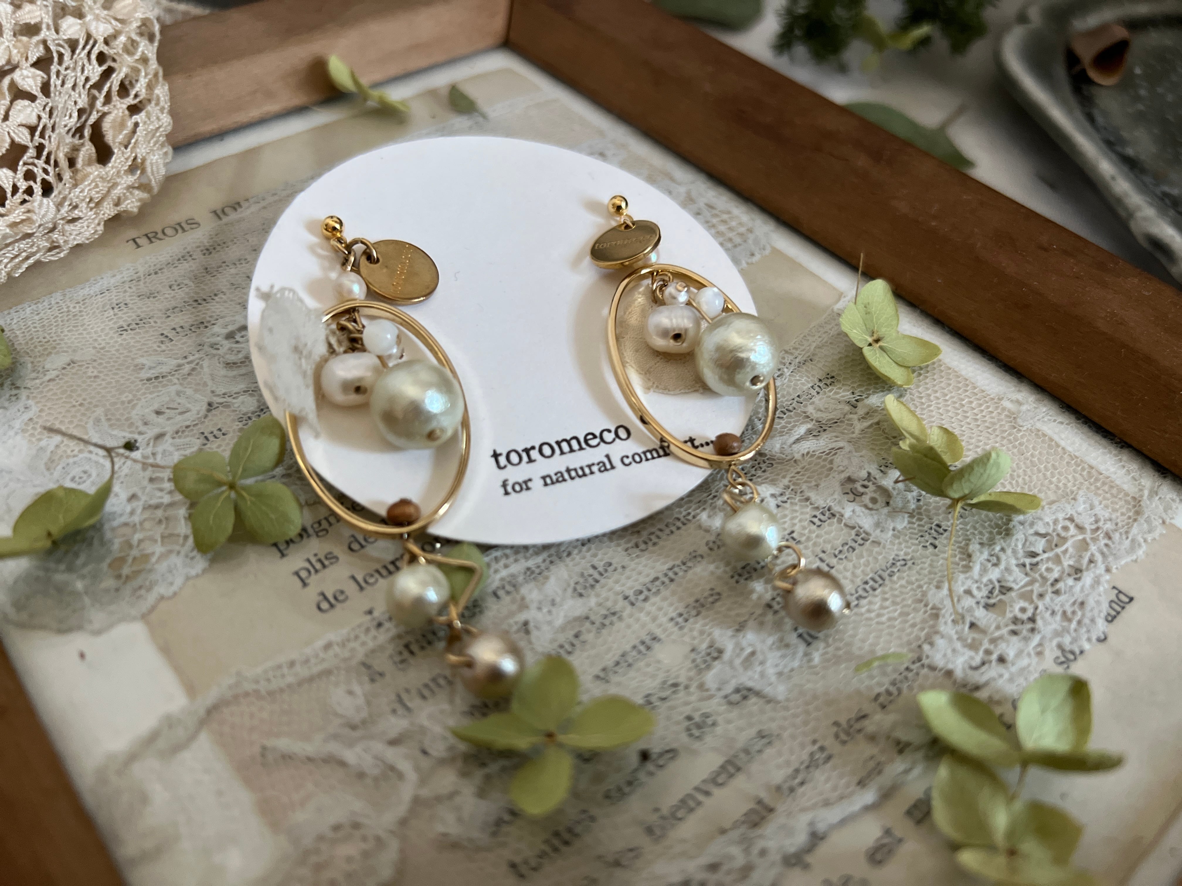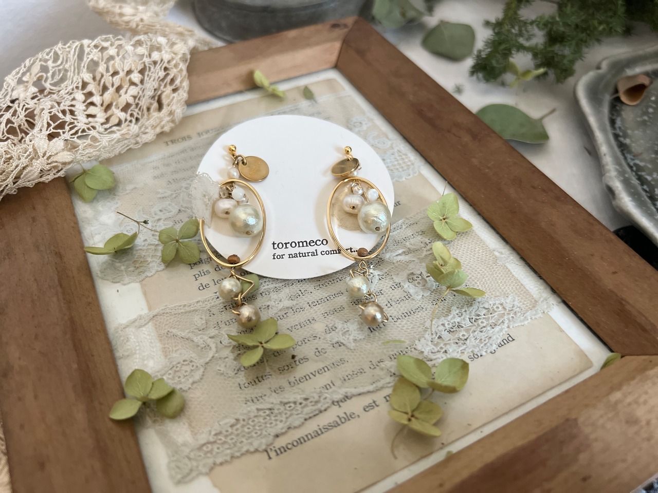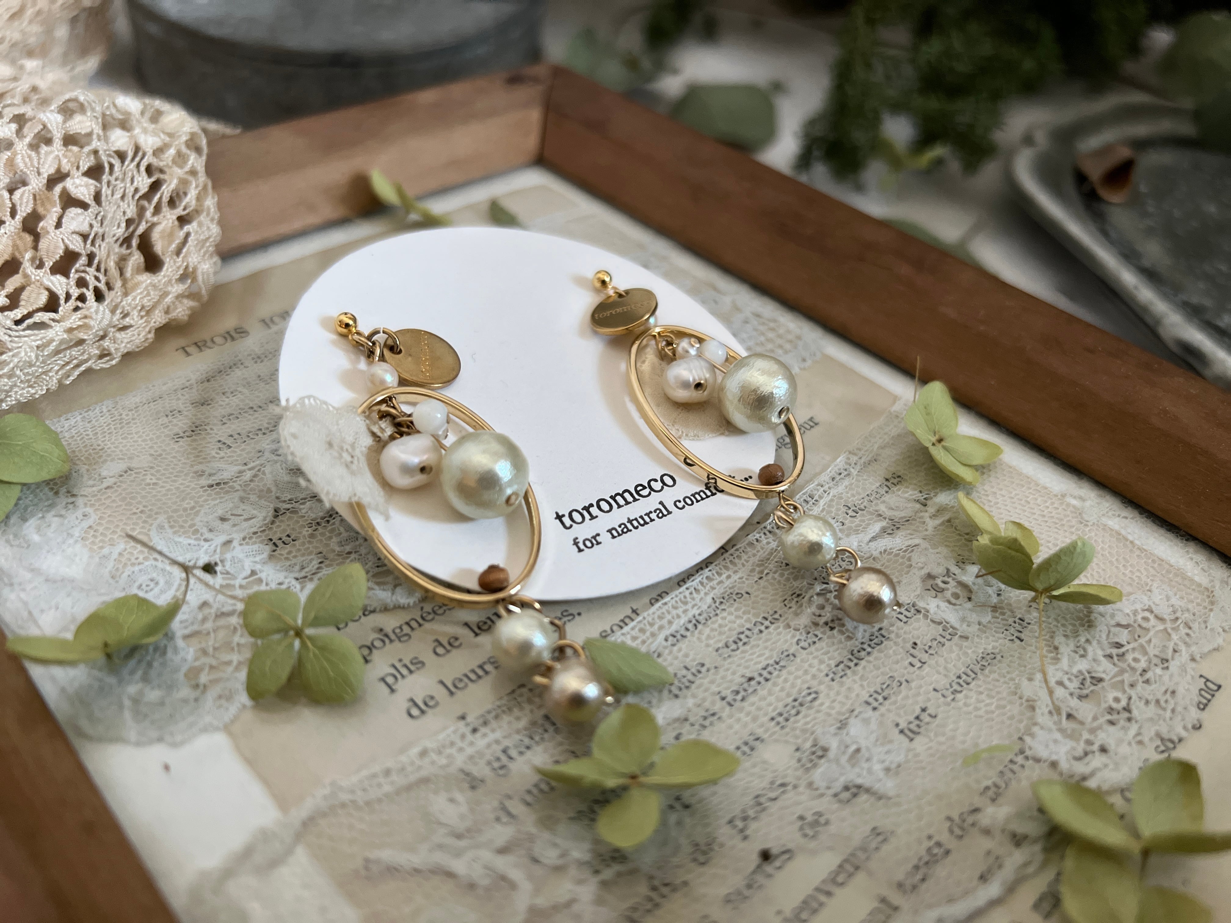 お顔周りは揺れるパールやビーズにちょっぴり可愛らしさを添えたい時に手軽で使いやすい耳飾りです。