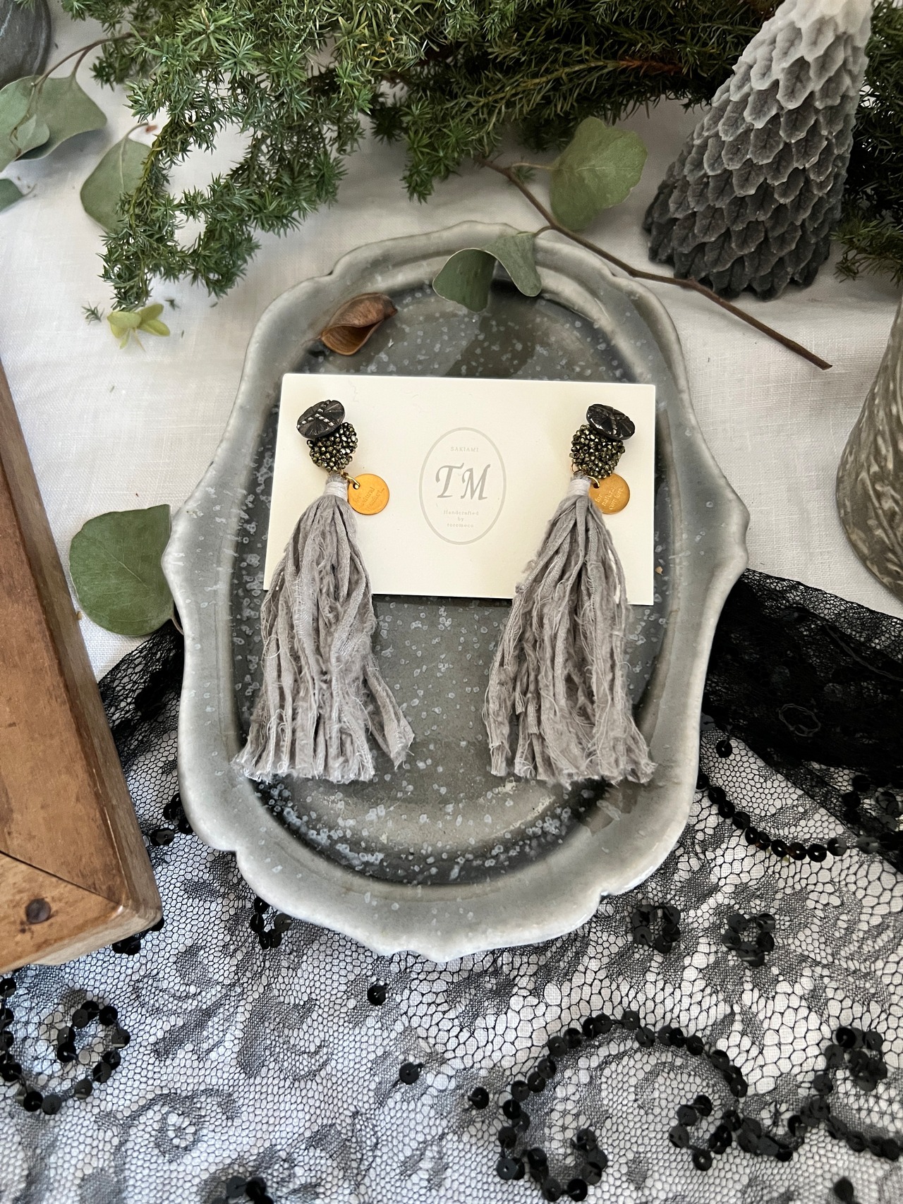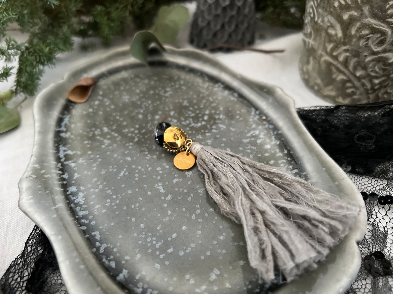 そのミミを裂いた風合いを生かしてタッセルに纏め、アンティークのメタルビーズとボタンで繋ぎ添えた耳飾り。