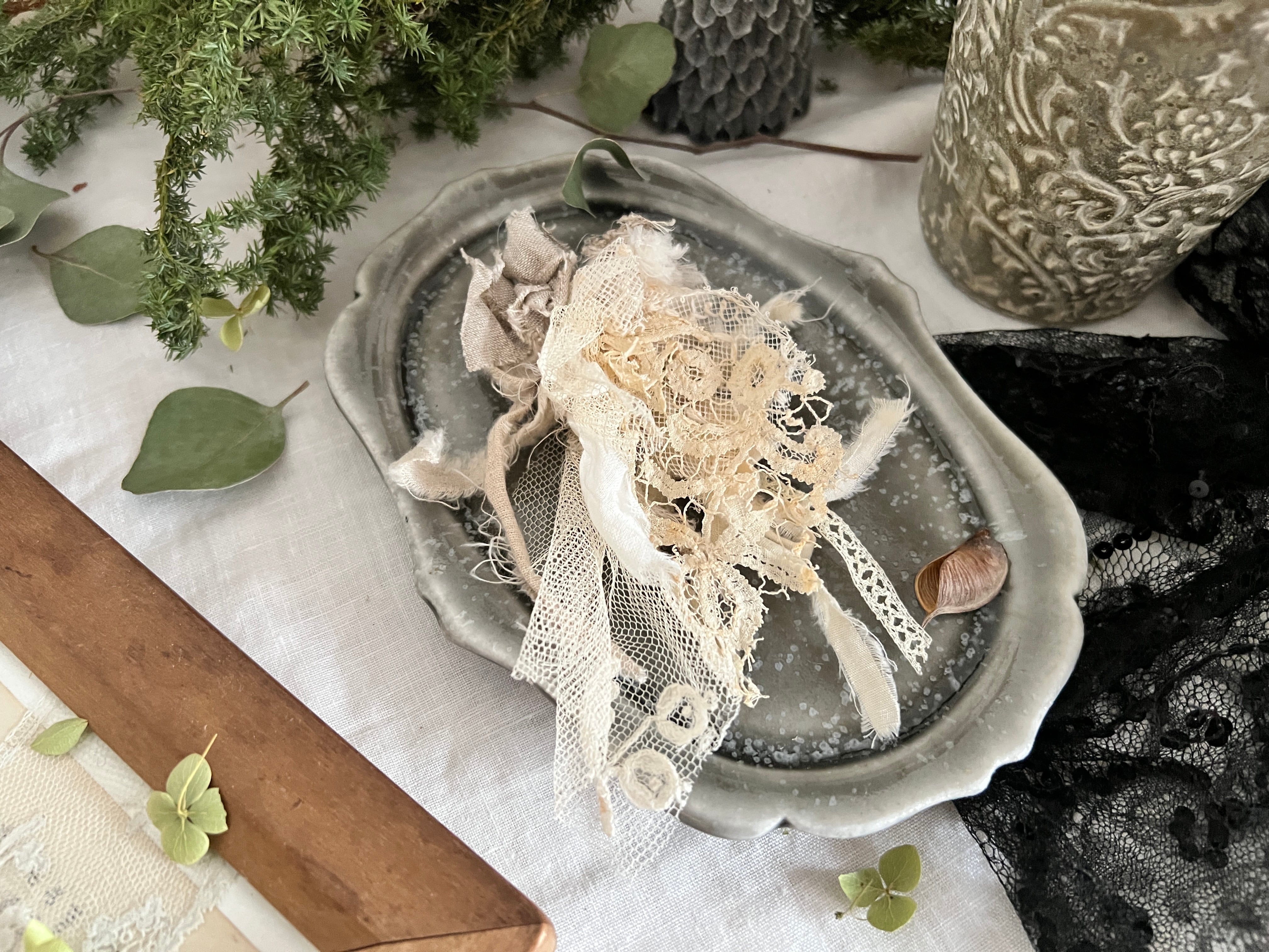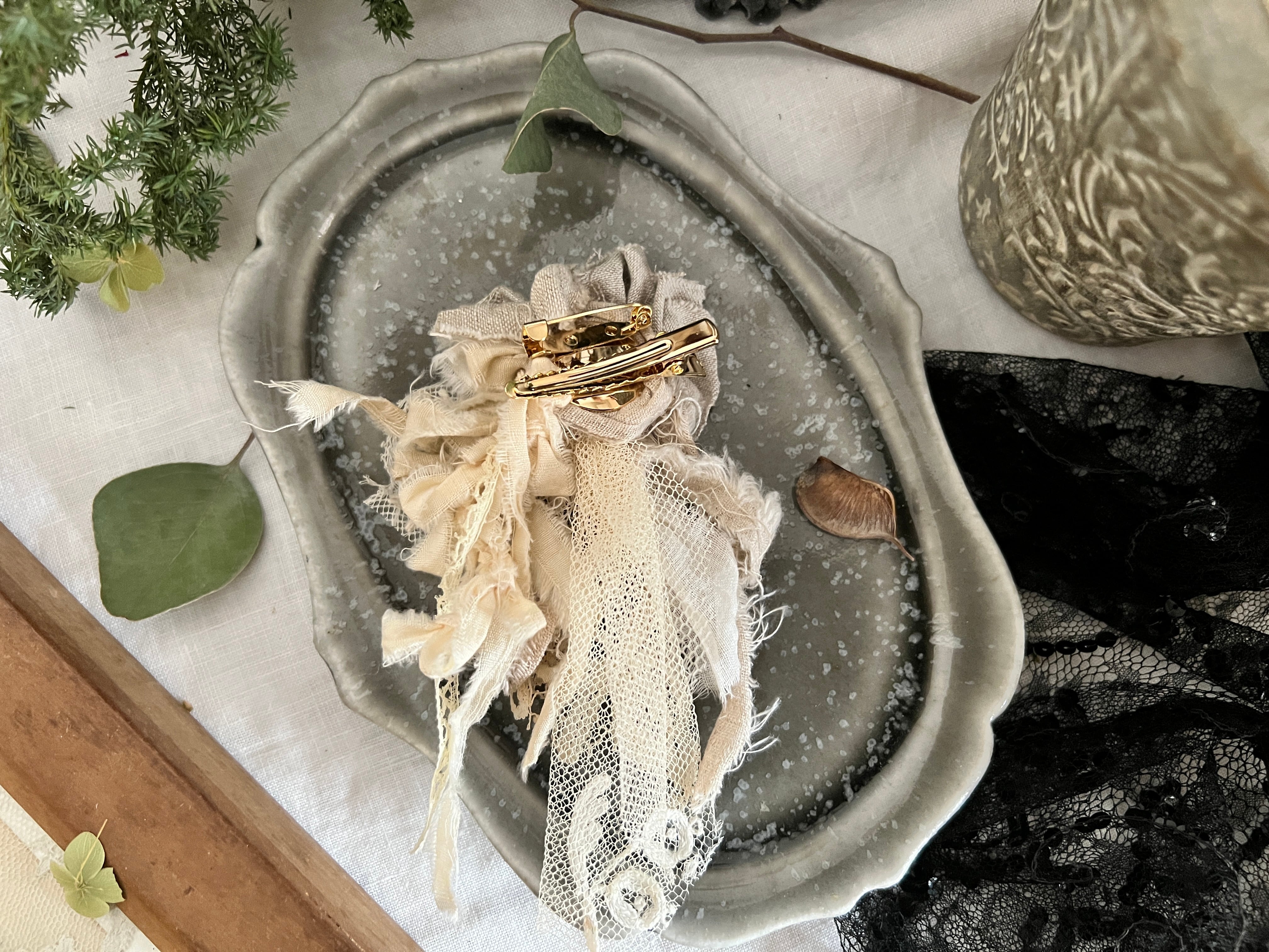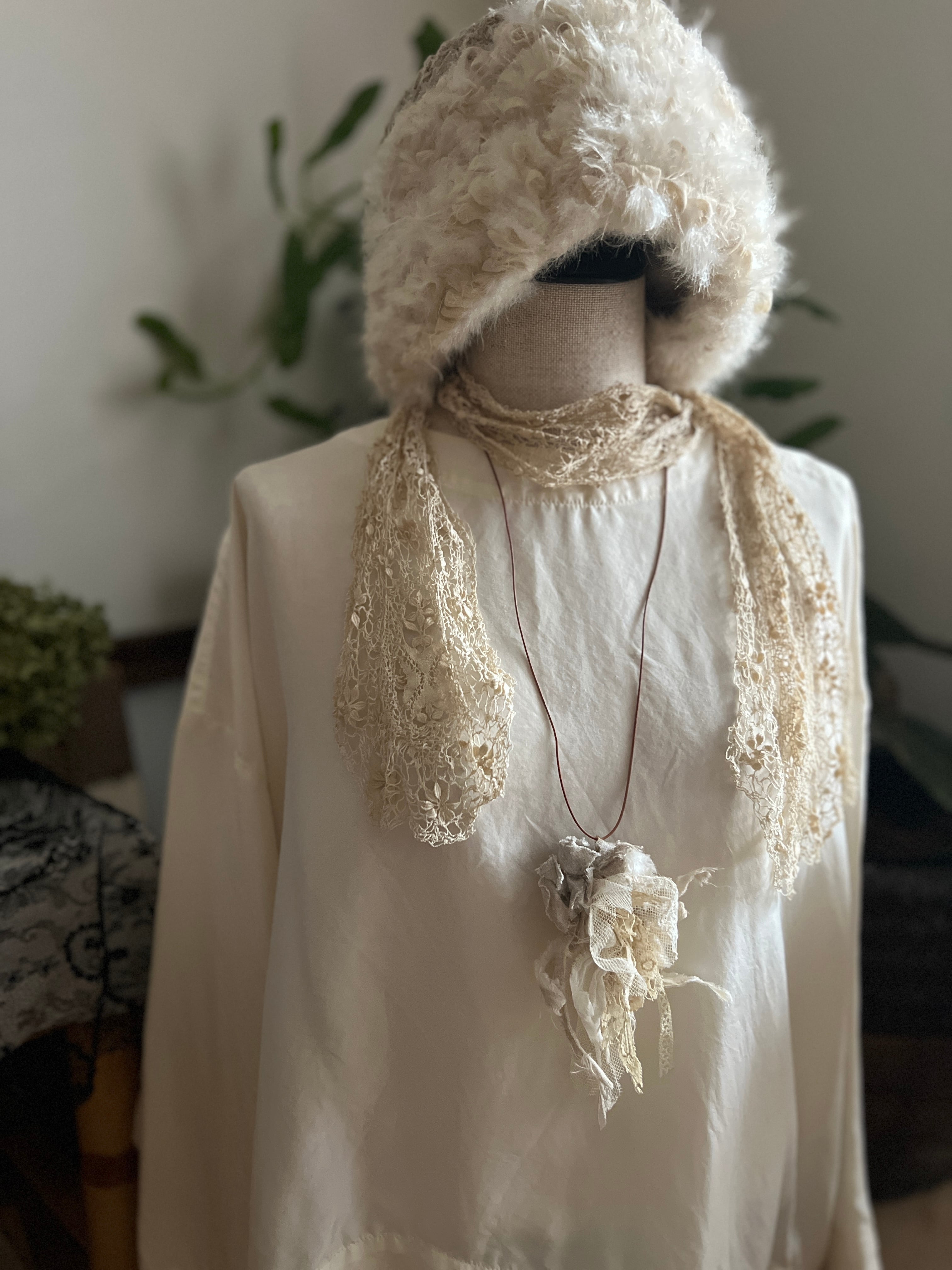取り外しのできる裂き編みとアンティークレースの飾りは通常はクリップ付きのブローチピンのみのお仕立てですが、こちらは特別にネックレスにもできる金具パーツをおつけしています。