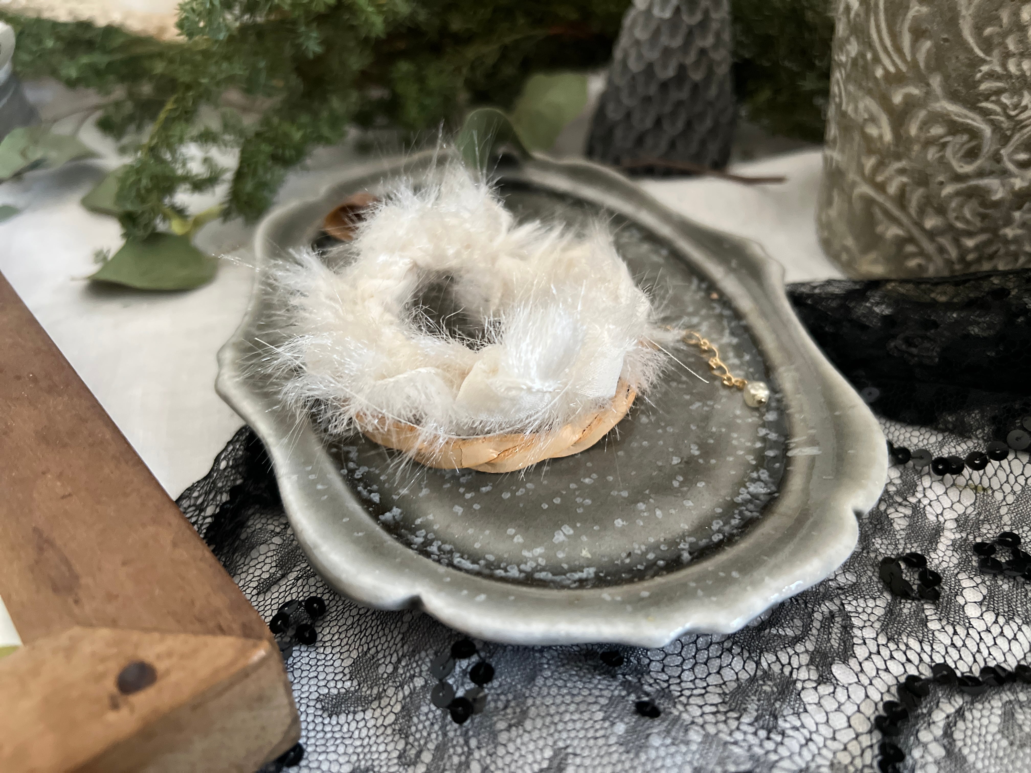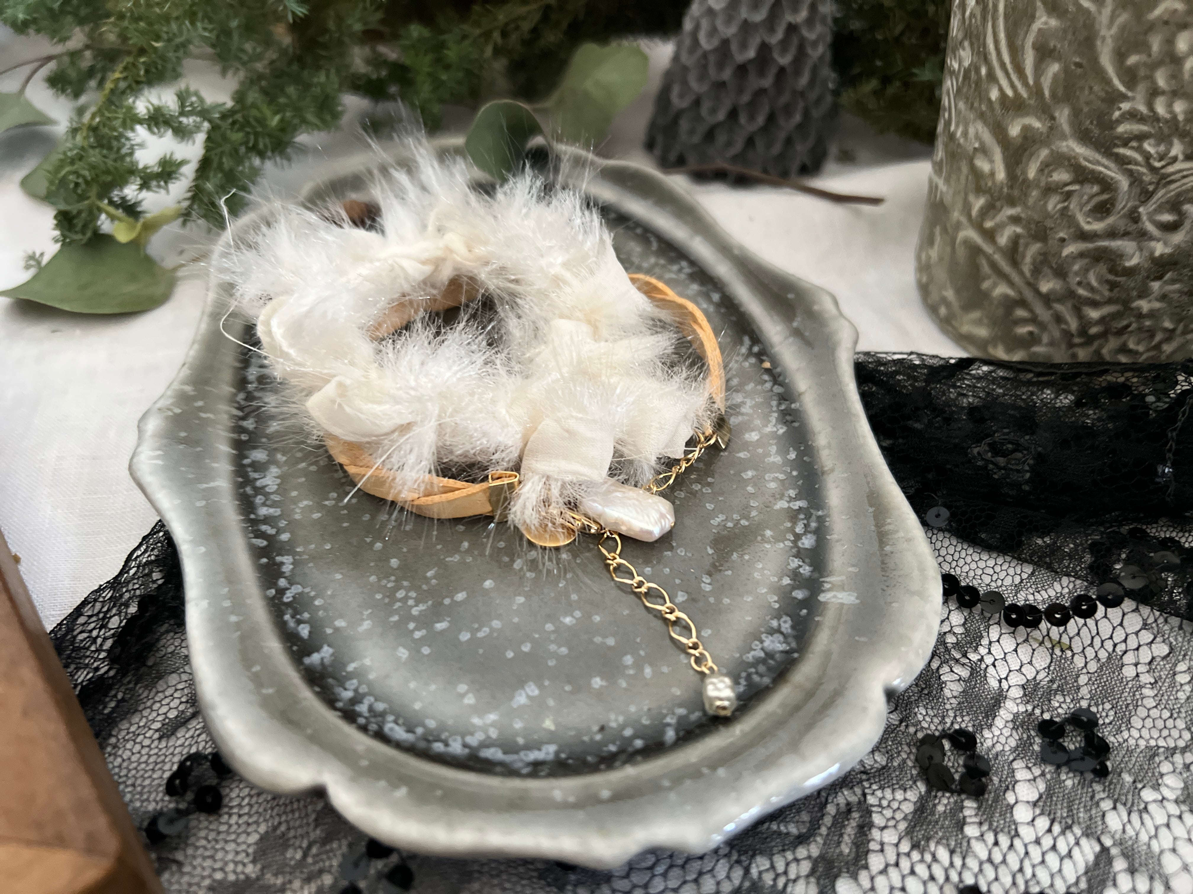 ツイストにアレンジしたレザーがふんわりエコファーを少し引き締め、大きなレクタングルの淡水パールとスフレビーズのアジャスターが煌めき揺らぐ大人可愛い一品です。