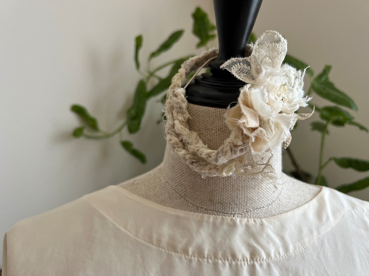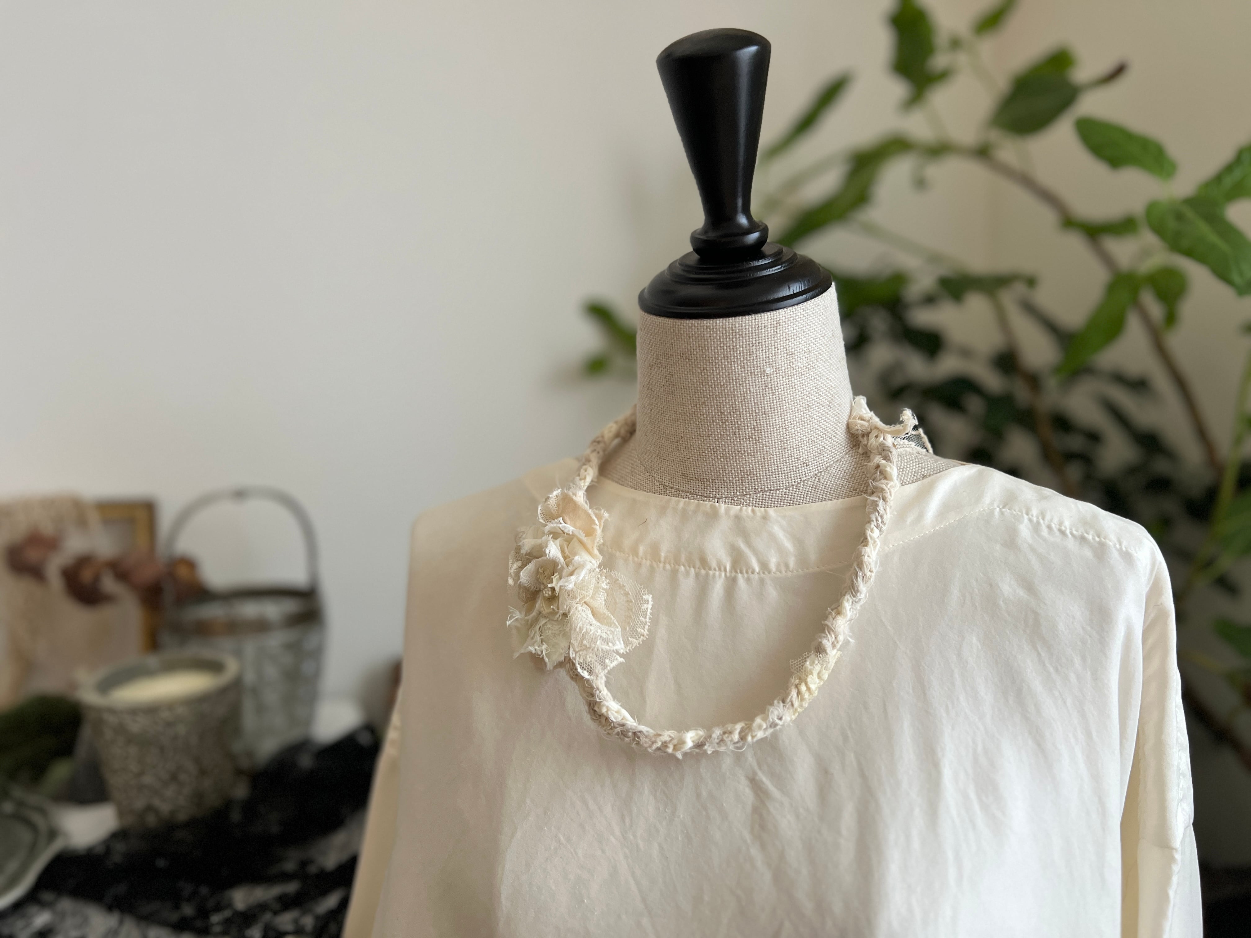 アンティークレースを使った商品については経年による変色が見られるものもありますがご承知頂き、風合いとしてお楽しみ頂ければ幸いです。