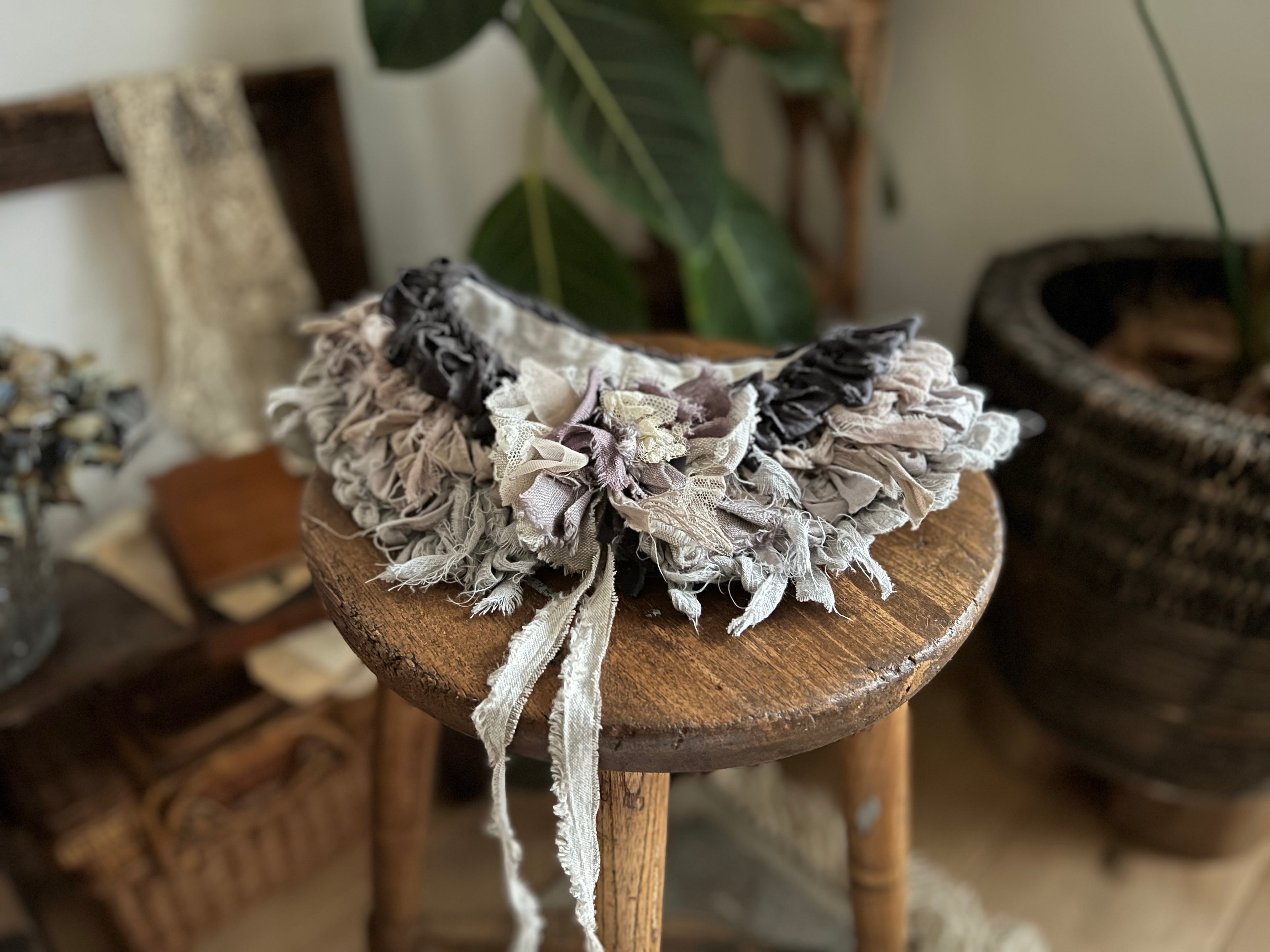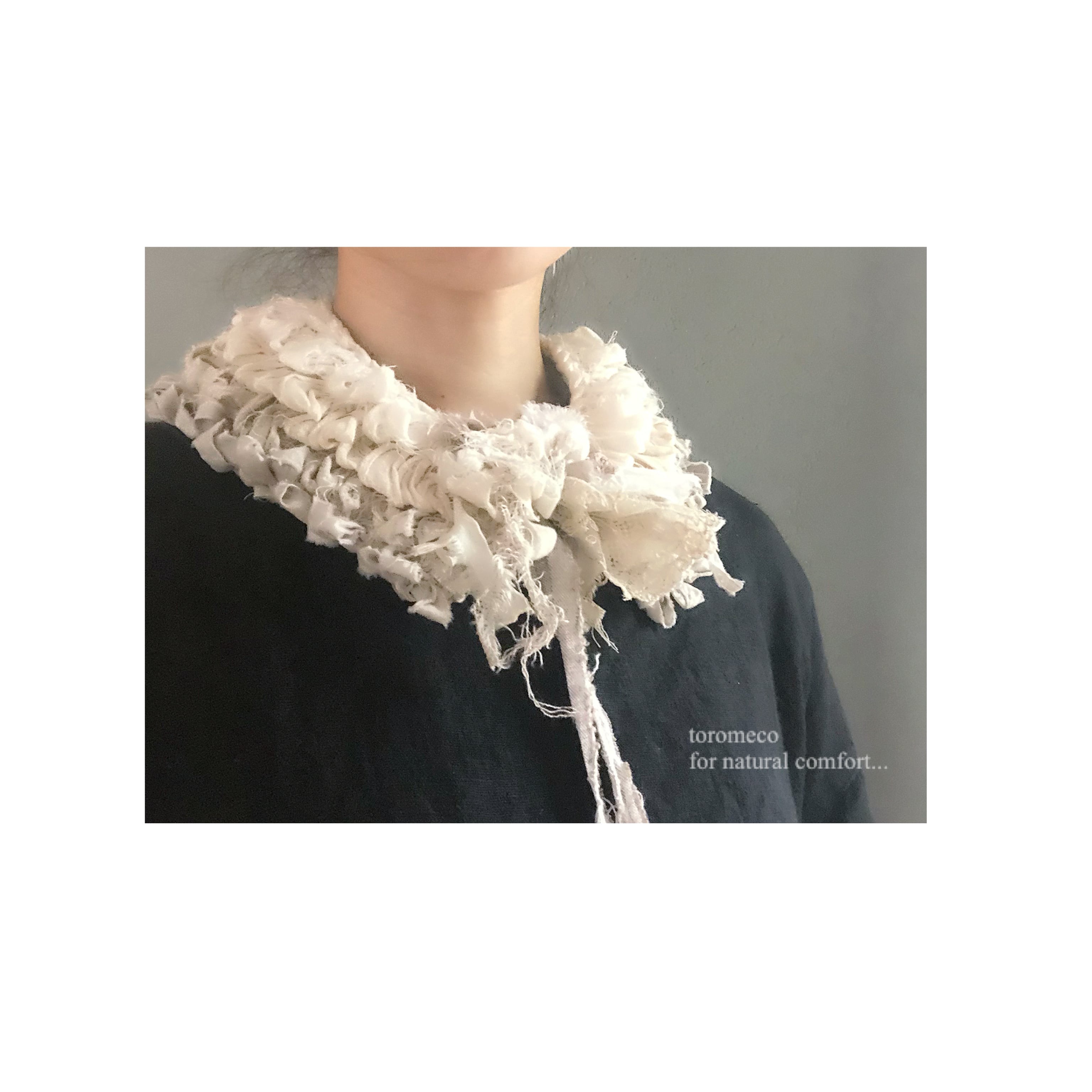 コットン素材のさまざまな裂き布で編んだ総フリンジで豊かな風合いのティペットです。