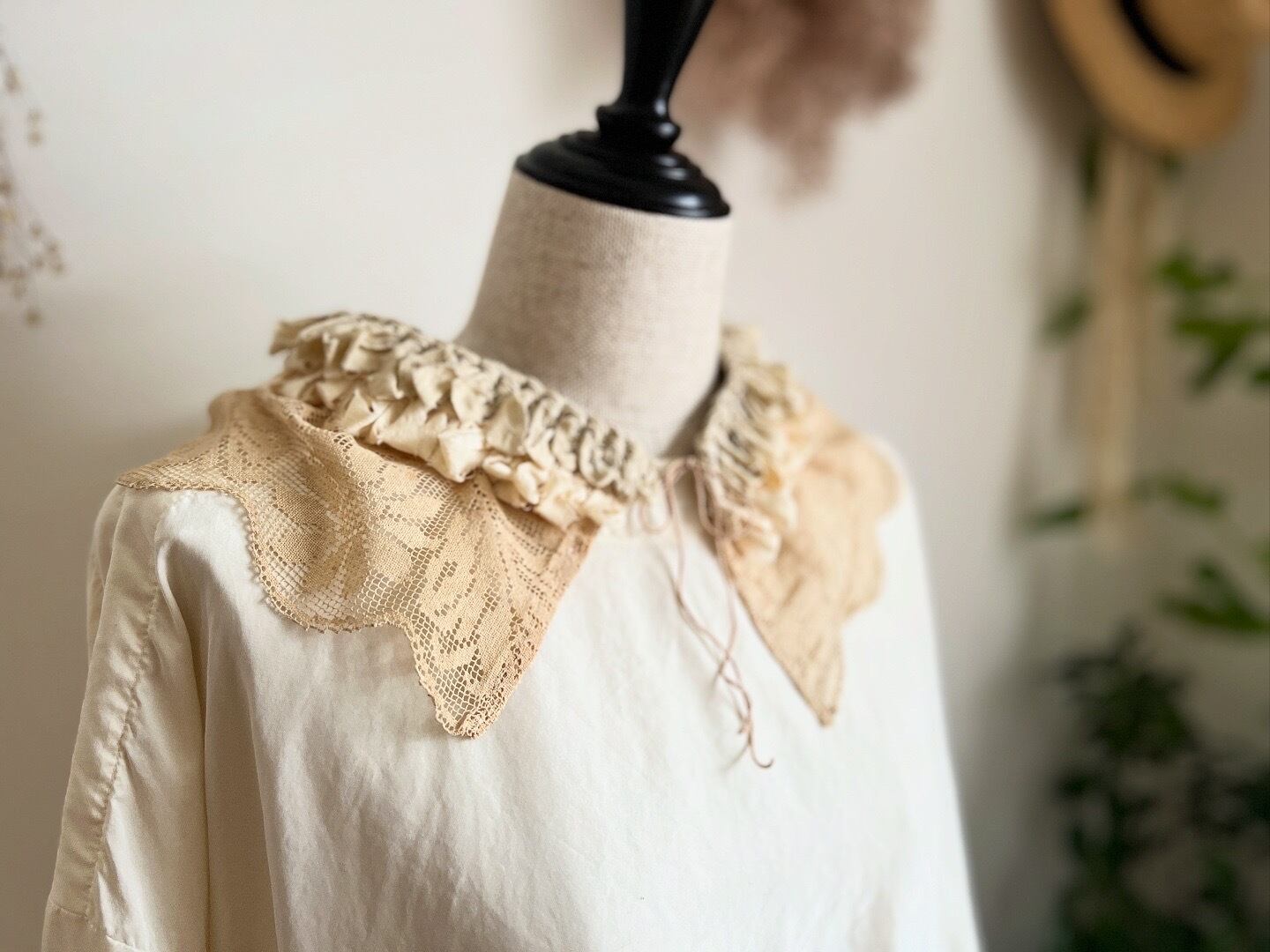 本商品はアンティークなど年代物のレースを使用しております。経年による変色がわずかにみられることがありますが風合いとしてお楽しみ下さい。