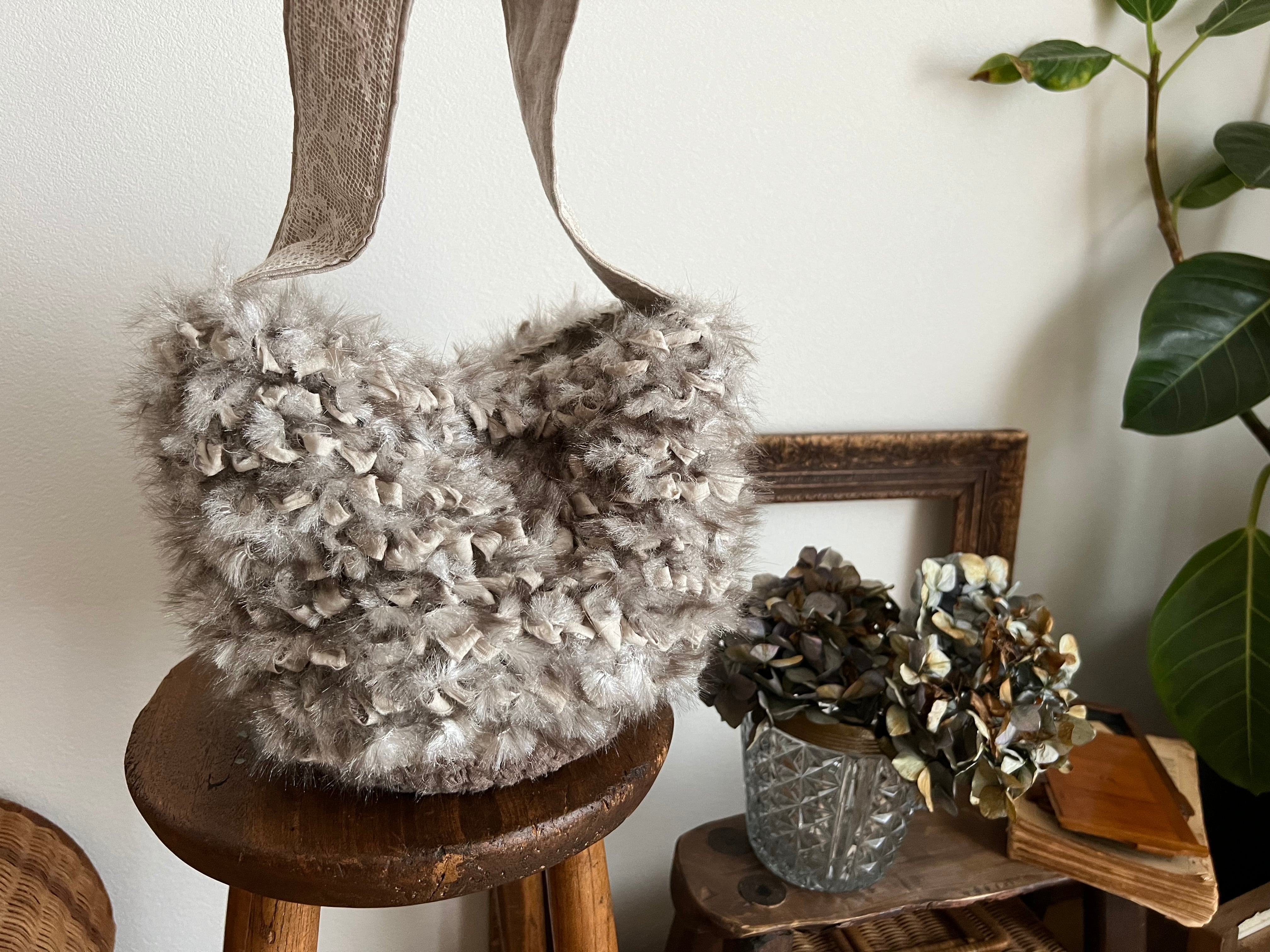 裂き編みとエコファーで編んだバッグです。